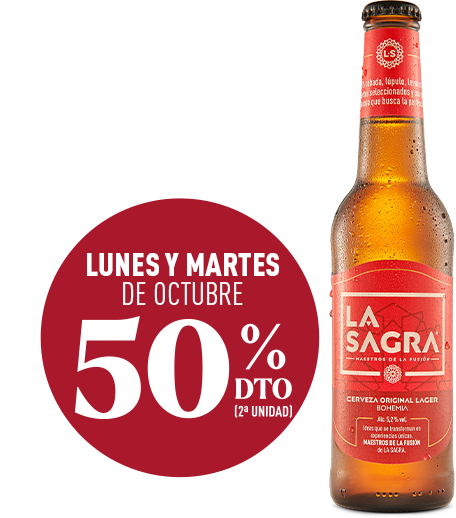 Promoción válida de la 2ª unidad del mismo producto. Solo los lunes y martes de octubre de 2025. No acumulable a otros descuentos.LA SAGRA recomienda el consumo responsable. 5,2% vol. +18 Que tu semana a finde empiece con sabor
